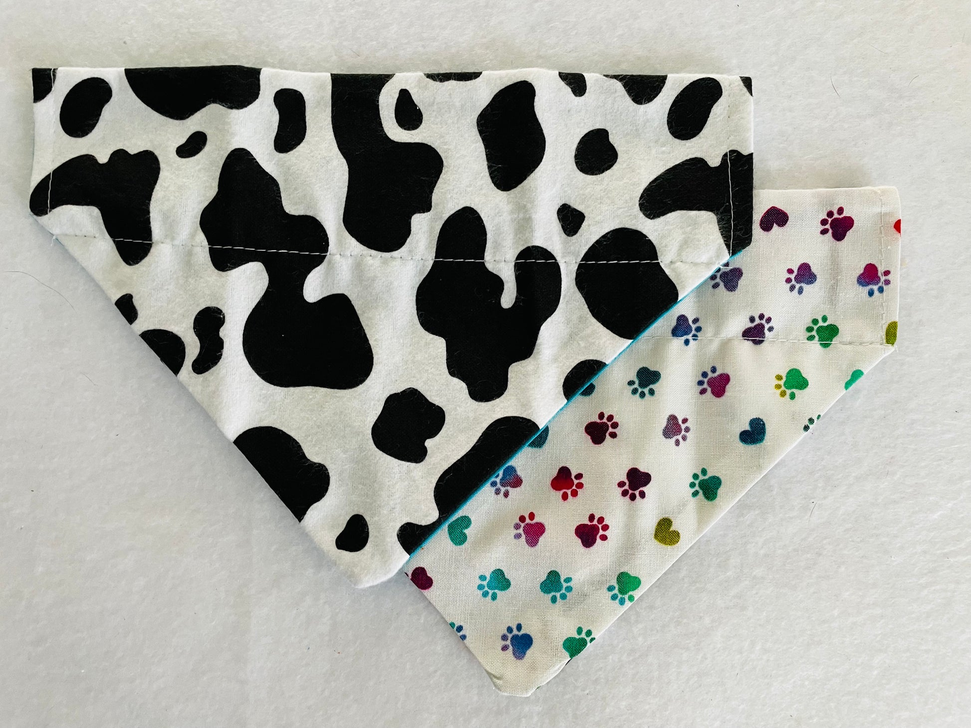 Reversible Bandana: Cow Print on one side and Multi-Colored Pawprints & Hearts on the other side