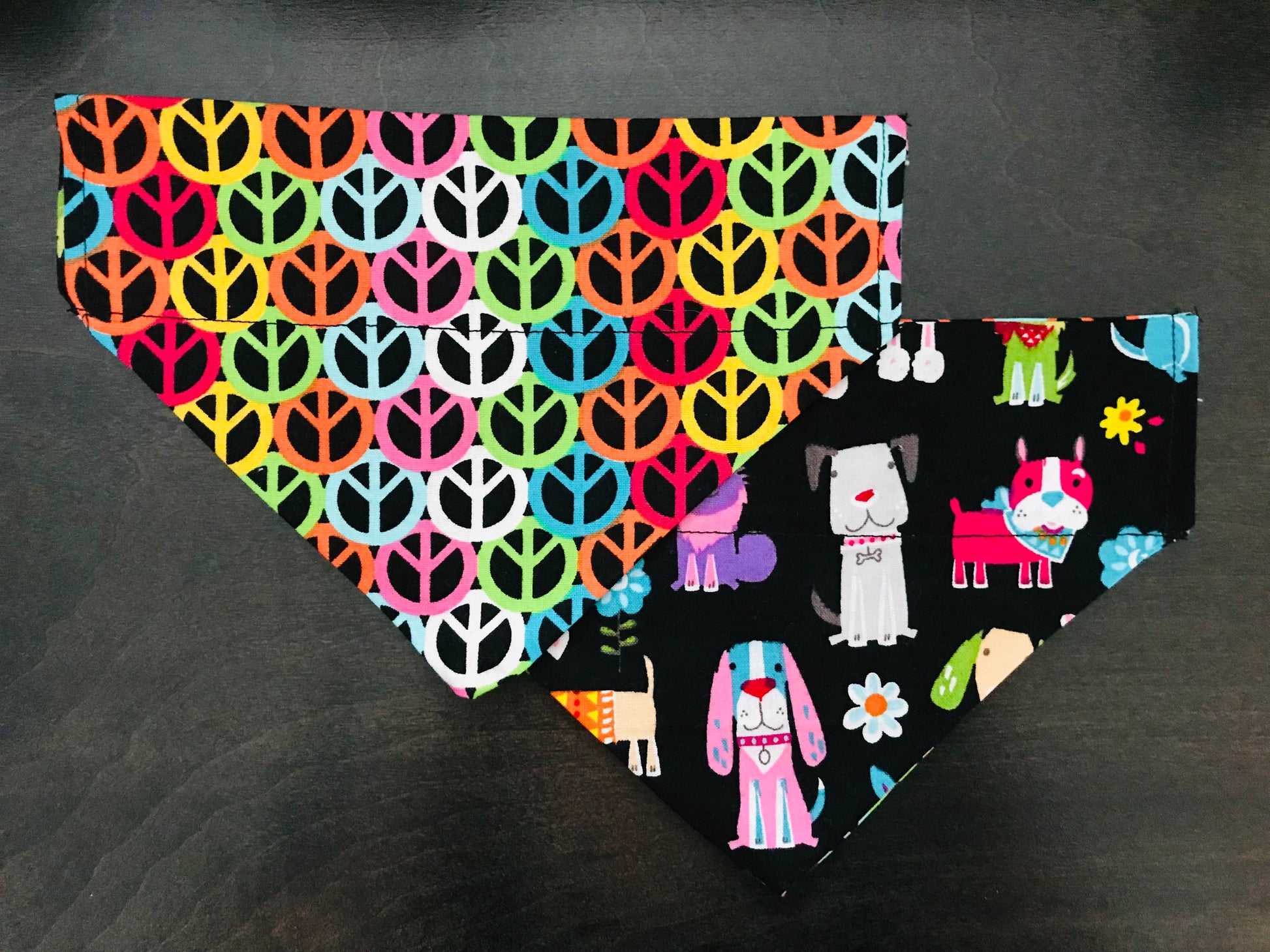 Reversible Bandana: Dogs (Black background) on one side and Multi-Colored Peace Signs on the other side