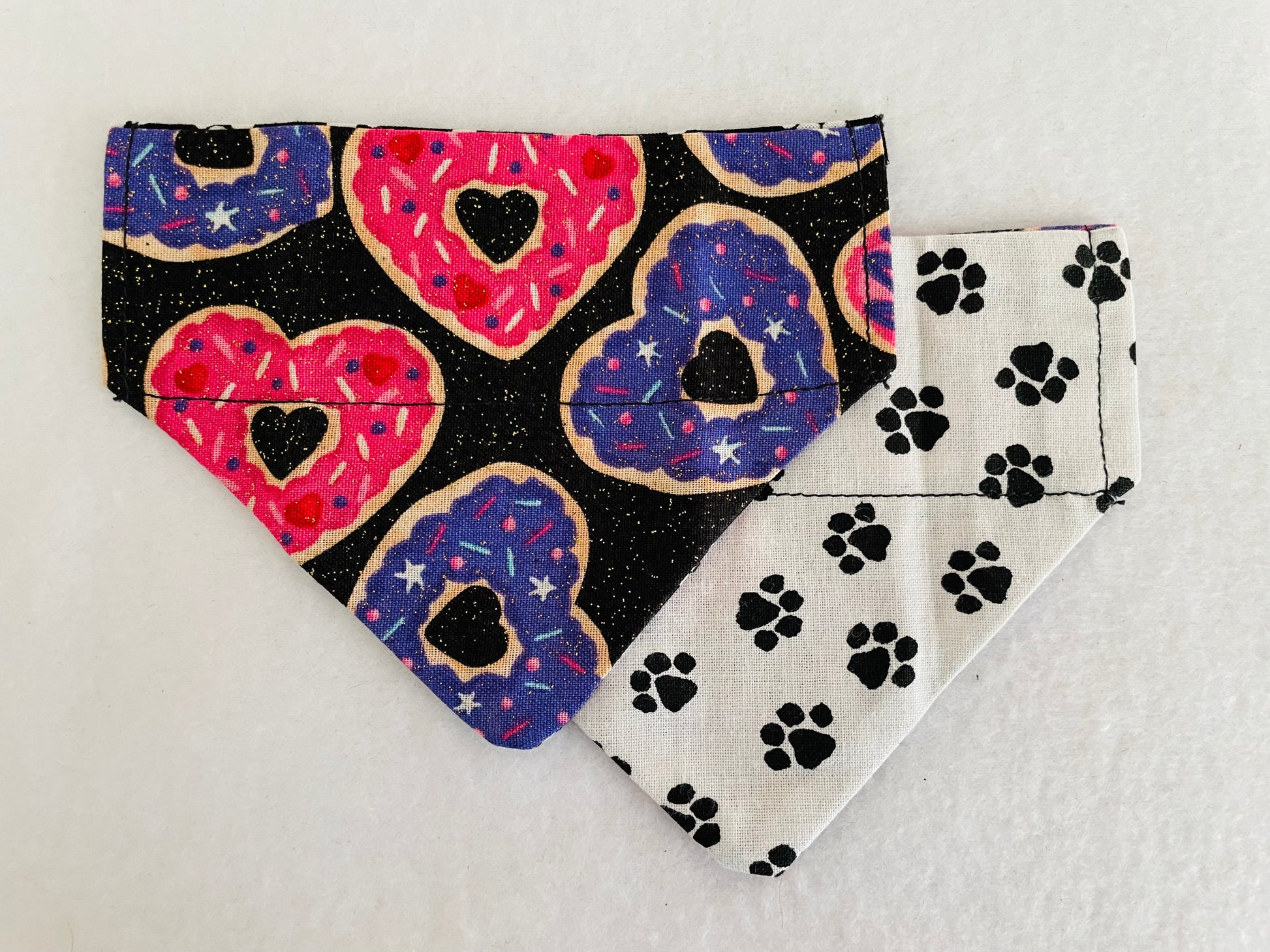 Reversible bandana: Donut Hearts on one side and Black Pawprints on the other side