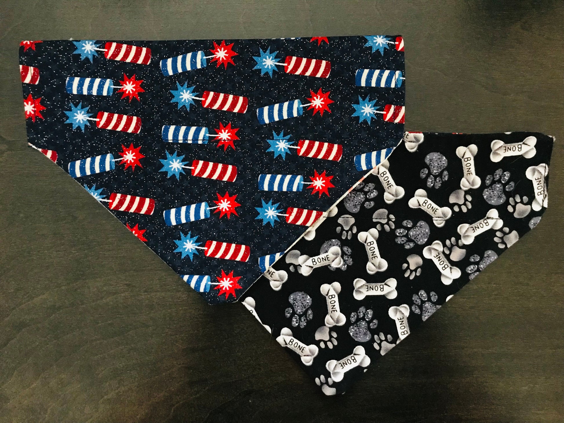 Reversible Bandana: Firecrackers on one side and Black Pawprints & Bones on the other side