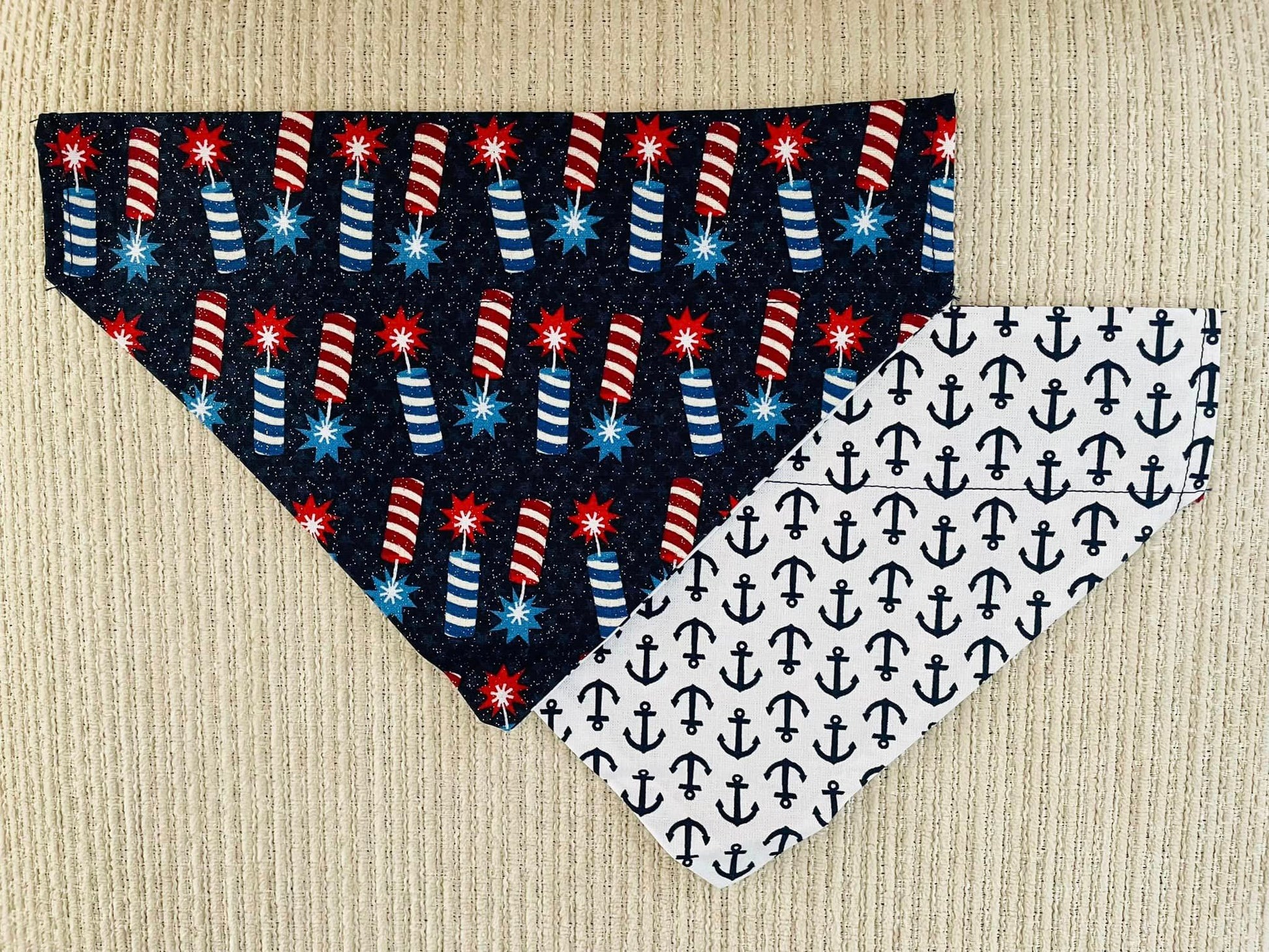 Reversible Bandana: Firecrackers on one side and Blue Anchors (White background) on the other side