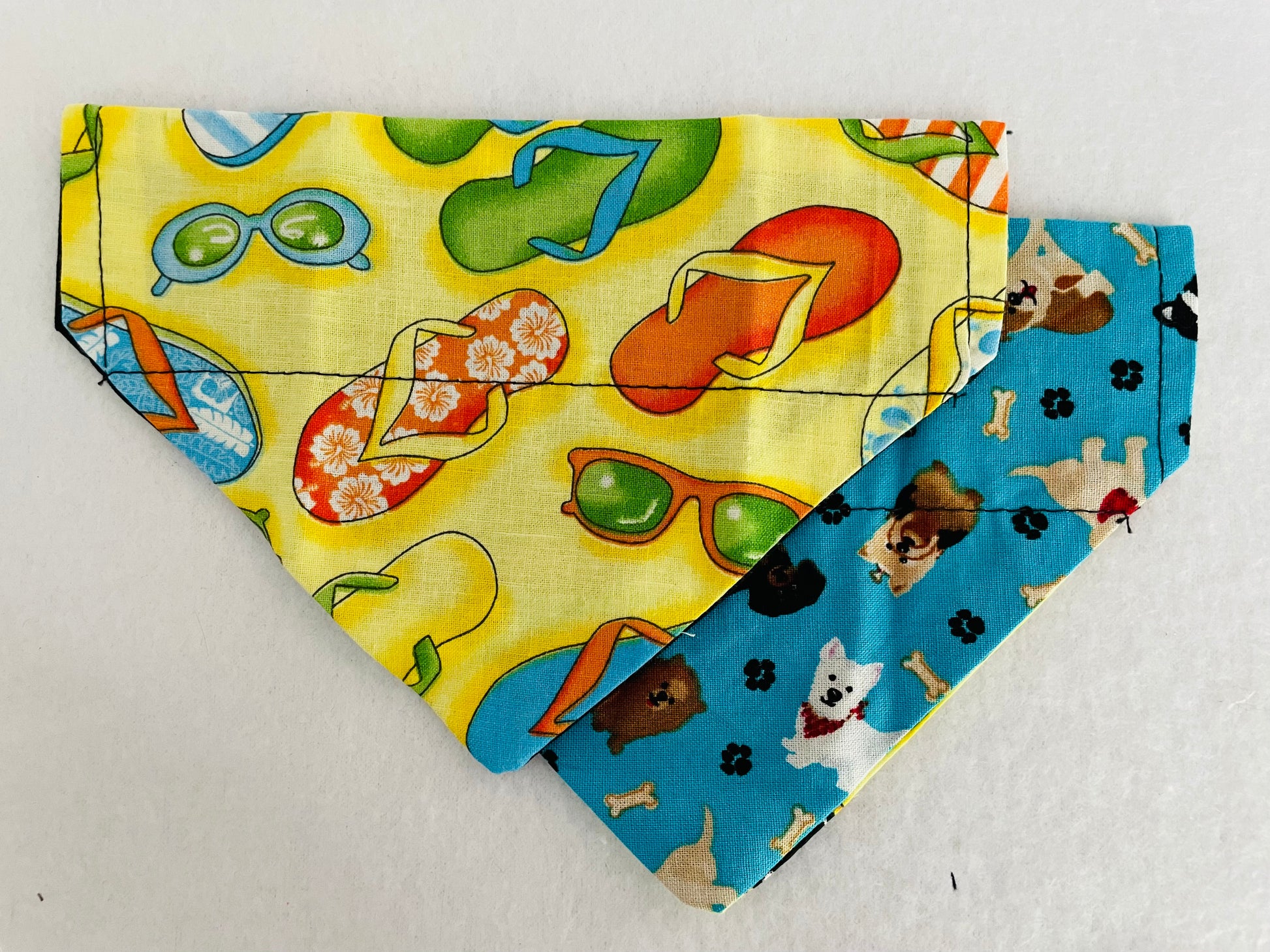 Reversible Bandana: Flip Flops & Sunglasses on one side and Multiple Dogs & Pawprints (Blue background) on the other side