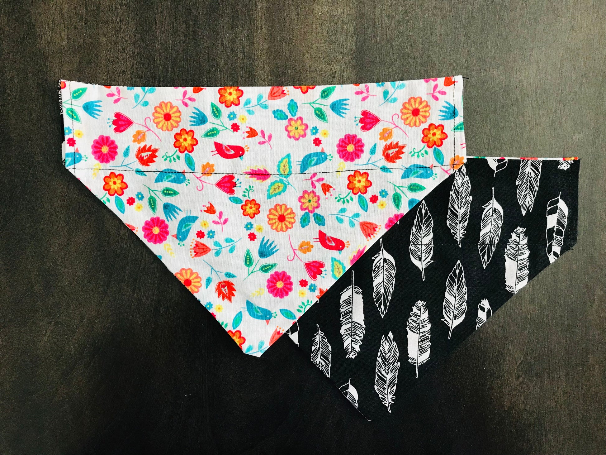 Reversible Bandana: Flowers & Birds on one side and White Feathers (Black background) on the other side