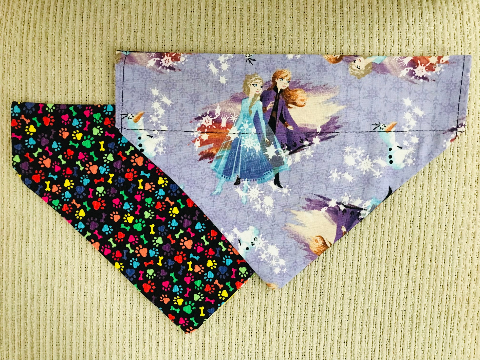 Reversible Bandana: Multi-Colored Pawprints & Bones on one side and Frozen on the other side