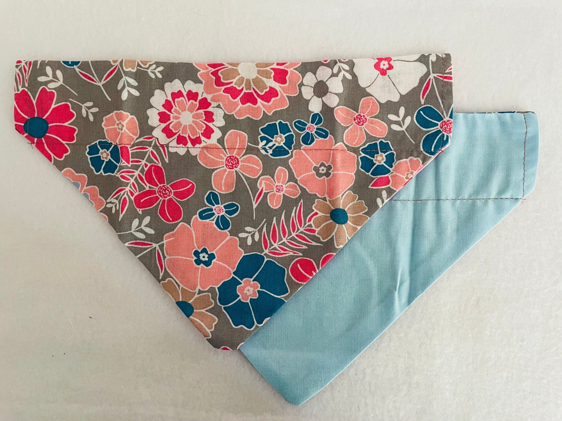 Reversible Bandana: Pink & Blue Flowers on one side and Solid Light Blue on the other side