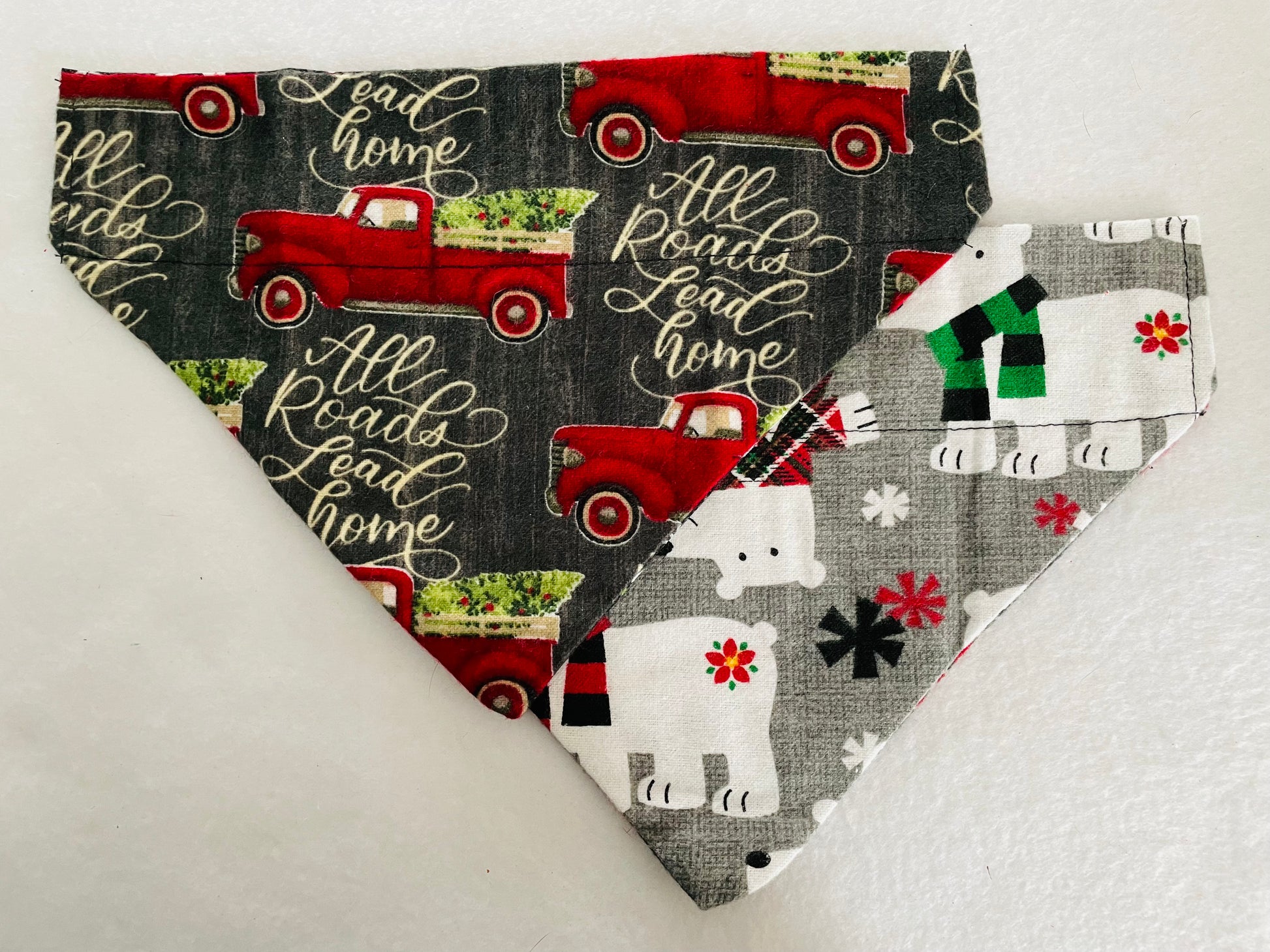 Reversible Bandana: Red Truck with Christmas Tree on one side and Polar Bears on the other side