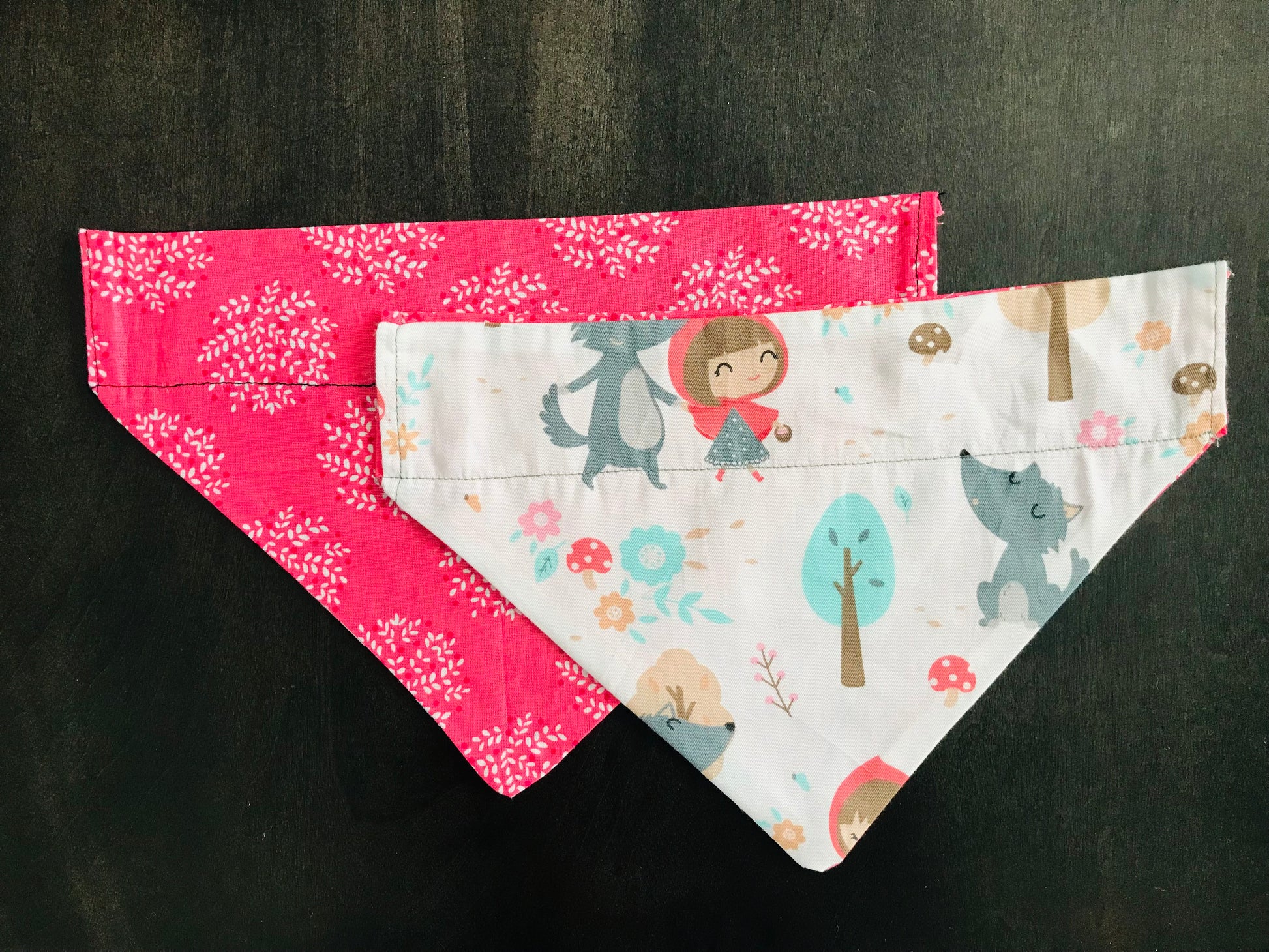 Reversible Bandana: White Leaves (Pink background) on one side and Little Red Riding Hood on the other side